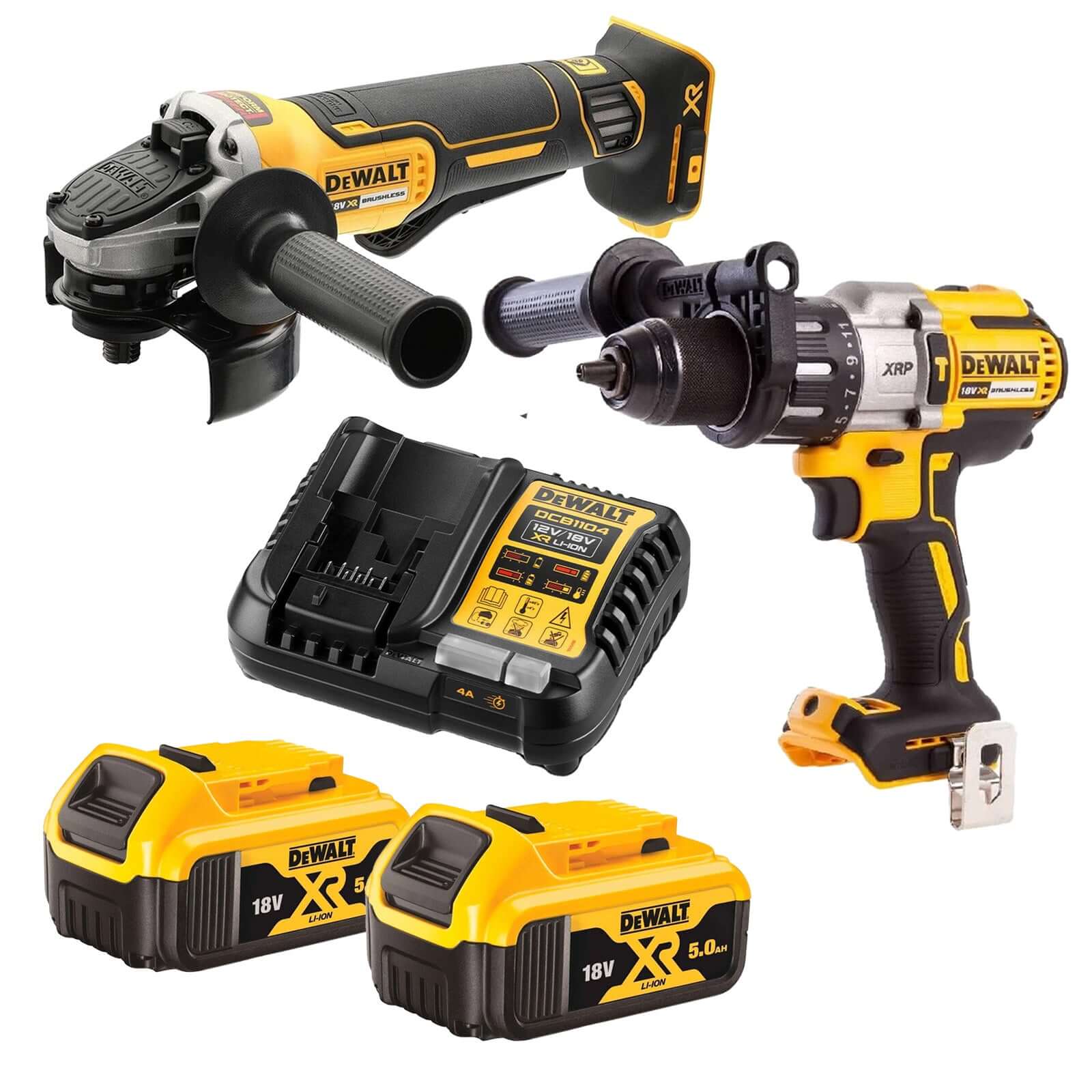 Upgrade projects with the DeWalt 18V drill and grinder combo kit, the ultimate cordless tool solution for power users. This kit includes a DCD996 hammer drill, DCG406 angle grinder, two DCB184-XE 5.0Ah batteries, and a DCB1104-XE charger—everything you need for tough demands. Harness unmatched versatility and runtime for drilling, grinding, and fastening tasks on site or at home. DeWalt's brushless technology and power tools reliability ensure outstanding performance, long tool life, and job-ready efficiency, helping you power through workloads with confidence.